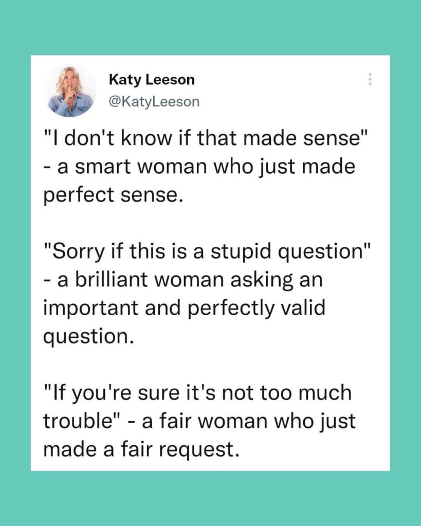 I came across this tweet recently and it really convicted me. I am supposed to be a leader and an example, and I realized that I regularly use this line when I am uncertain if my idea will be well- received: “I don’t know if that made sense.” I guess it would be ok if I said that because I was feeling like maybe my idea was not logical. But I tend to say it when I am certain about what I am saying, but I think it may not go over well. Not good.