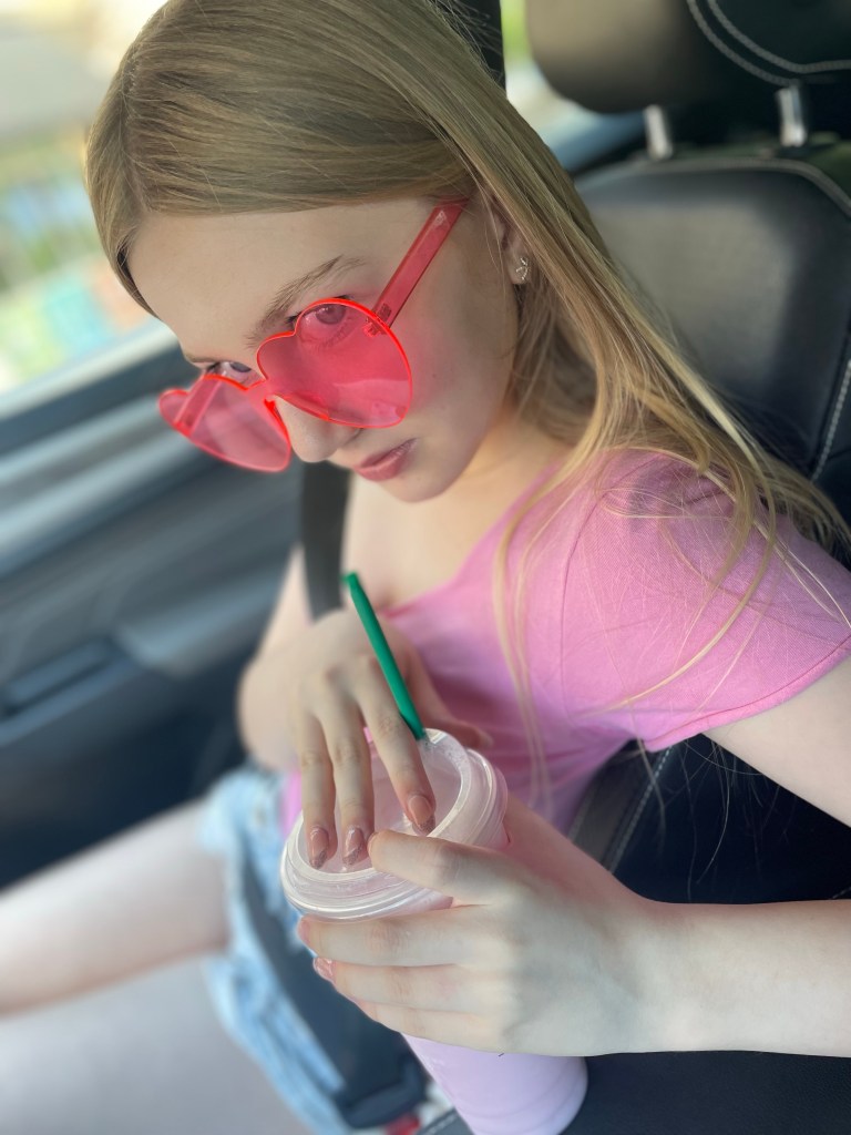 Audrey’s summer look was very similar to her winter look: side eye with a Starbucks pink drink in her hand. I threw out my strict rule about bikinis at 13 because I love watching her walk with confidence into the water park, completely uncaring of the scar on her abdomen.