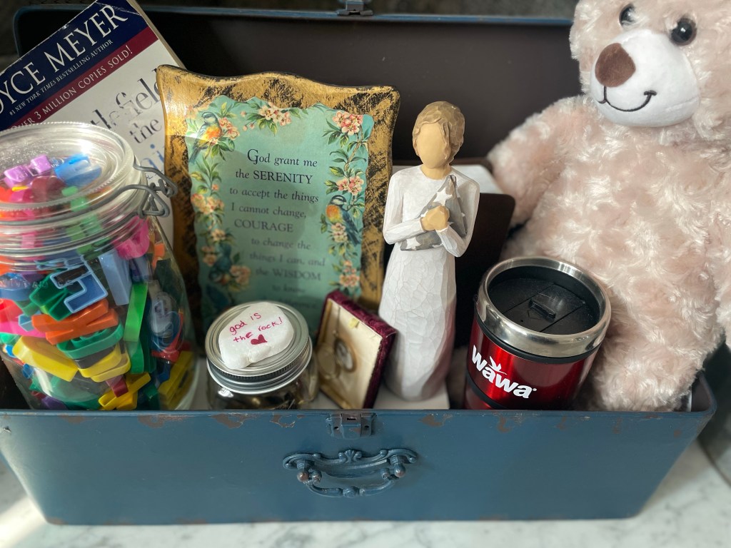 I think I finished filling an old but refinished toolbox for my family room – a box of tools that have helped me adapt, gave me guidance, or enabled me to fix things over the years. It has pieces from family near and far, from earth to heaven, that will always guide me with the hard work.
