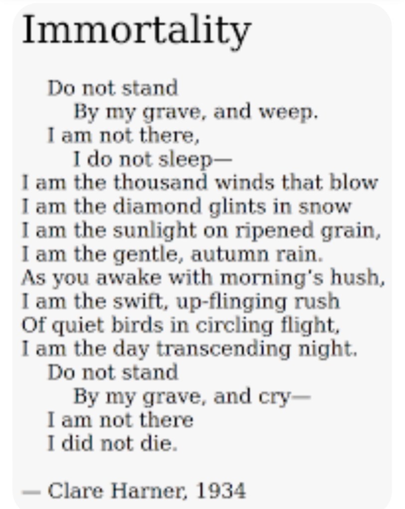As I prayed the Lord’s Prayer next to a stranger, also visiting a loved one and whose church service broadcast was coming through on her phone, I remembered all the times my Dad tucked us in and we said that prayer together. And the truth of Clare Harner’s words washed over me: he did not die. He still lives. In this world through all of the good things he planted in us, and in the next where there is no night.